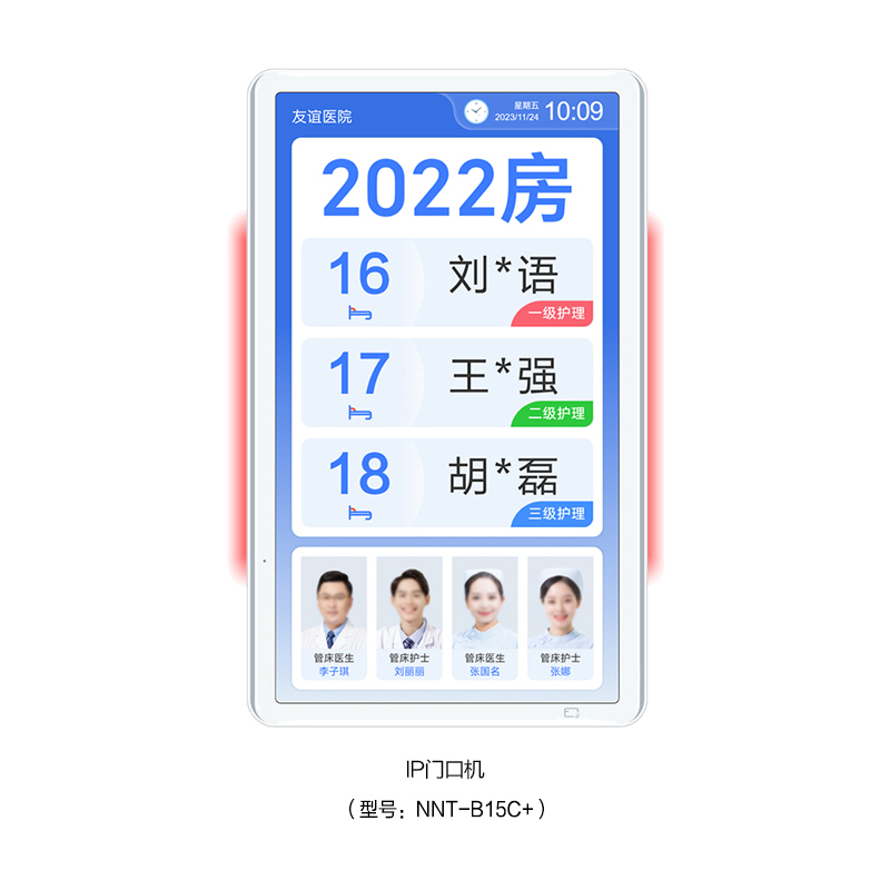 ? 采用15.6英寸觸摸顯示屏,內(nèi)置燈帶雙側(cè)發(fā)光設計,壁掛式安裝在病房門口。