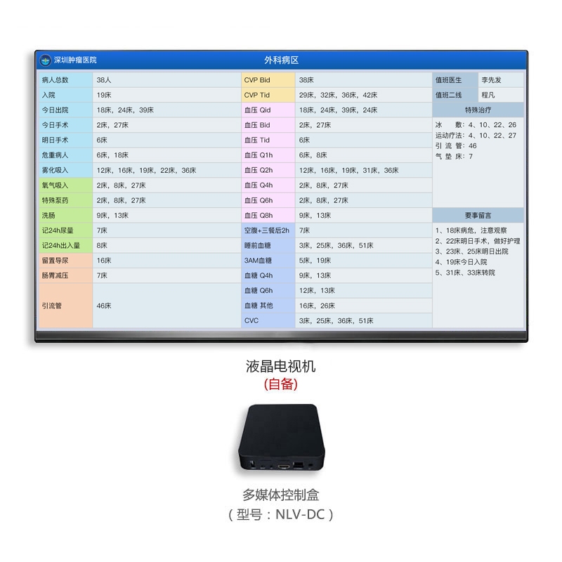 液晶電視機(自備)組成,可作為病員一覽表或信息看板使用,安裝在護士站。